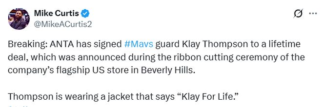 離開金州勇士、告別冠軍搭檔庫里后,他一度處境艱難,但如今在達拉斯找到了新歸宿。賽場內外都蒸蒸日上:庫珀-弗拉格新秀賽季便驚艷世界,而克萊與說唱歌手梅根-西-斯塔里昂的戀情曝光,也讓這位神射手一夜之間成為八卦媒體焦點。現在,克萊又多了一個開心的理由——他在洛杉磯全明星周末上,正式宣布與安踏簽下終身球鞋合約。