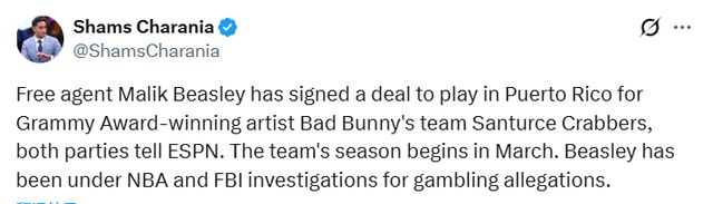 北京時間2月14日,據名記Shams報道,自由球員馬利克-比斯利已簽約加盟由格萊美獲獎歌手壞痞兔(Bad Bunny)擁有的波多黎各職業籃球隊——桑圖爾塞螃蟹隊。壞痞兔是名模詹娜的前男友。