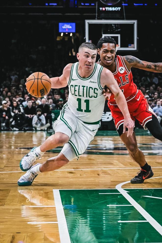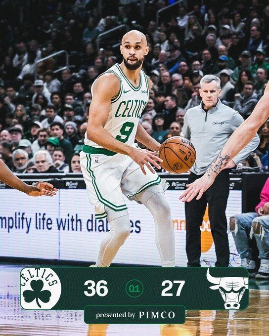 凱爾特人上一場主場89-111輸給尼克斯,公牛過去5場遭遇5連敗,本賽季前兩次交鋒雙方各取一勝。本場凱爾特人缺少塔圖姆,公牛缺少吉迪、奧科羅、科林斯。首節前半段雙方交替領先,纏斗至凱爾特人17-18落后,凱爾特人連得5分反超。公牛也連得5分,布朗與普里查德持續得分率隊反超比分,布朗7中4得到12分與普里查德5中4得到10分,兩人均是外線命中2記三分,首節結束凱爾特人36-27領先公牛。首節公牛20中10,其中三分8中5;凱爾特人25中14,其中三分11中6。
