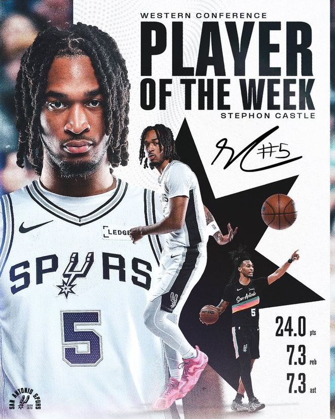 過去一周,卡斯爾場均24分7.3籃板7.3助攻3.0搶斷,投籃命中率63%,幫助馬刺拿下3勝0負的戰績。